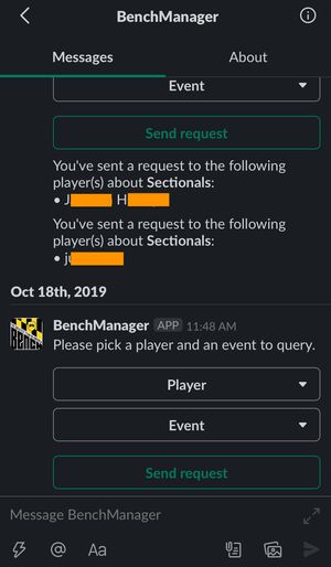 My first Django app. I made it to help automate gathering information from my Ultimate Frisbee team. It allows the user to create database entries for Players and Events, then use a Slack integration to send one-click queries about availability.